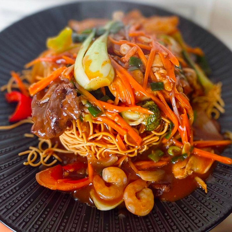 Tender beef, chicken, prawn and shrimp woked with onions, capsicums, broccolis, bok-choy served with crispy egg noodles in hot and spicy sauce. [ Mild ]