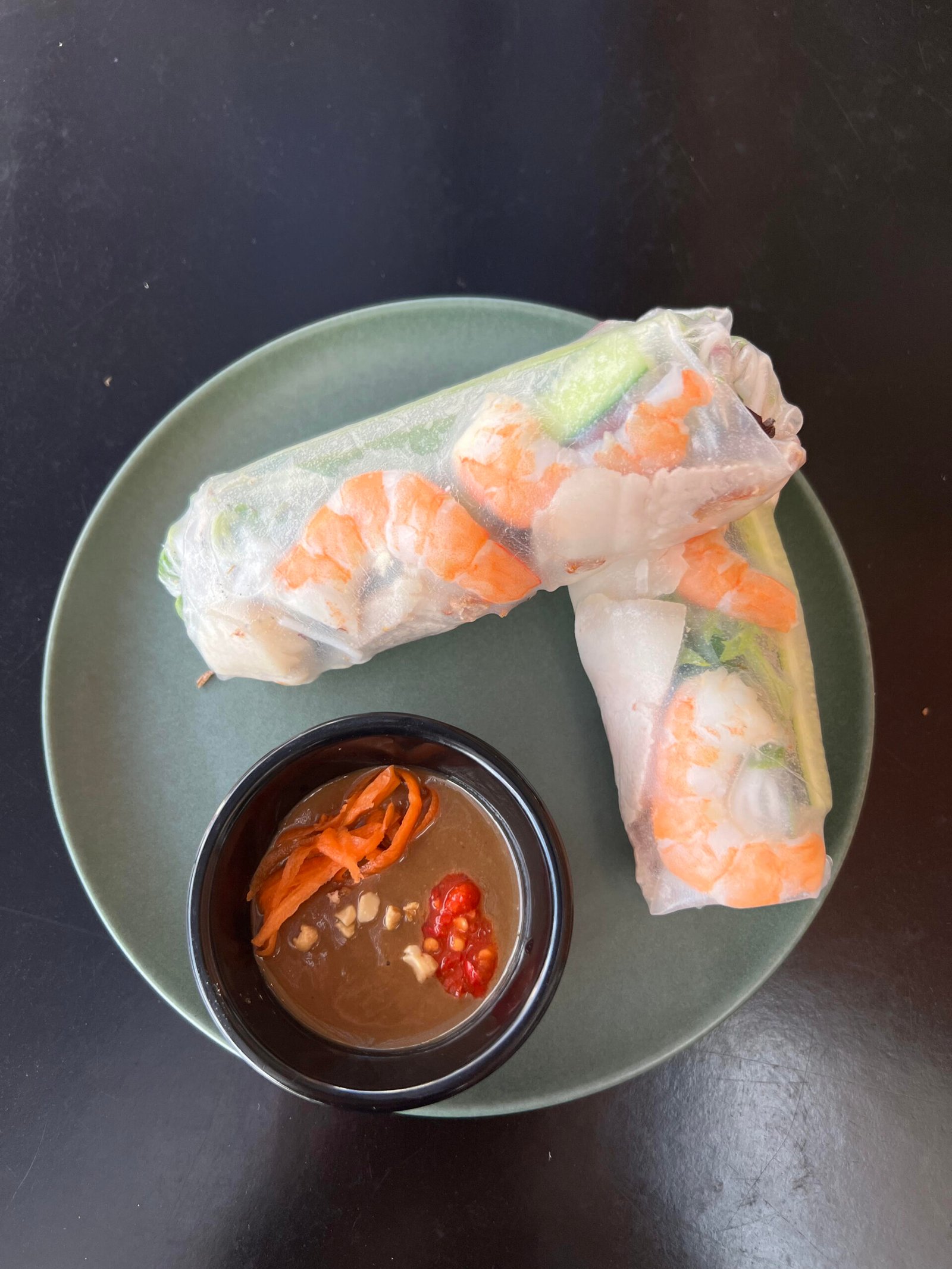 Fresh Prawn, mix salad, herbs, vermicelli noodles, crunchy shallots served with homemade hoisin sauce, peanuts and carrots.