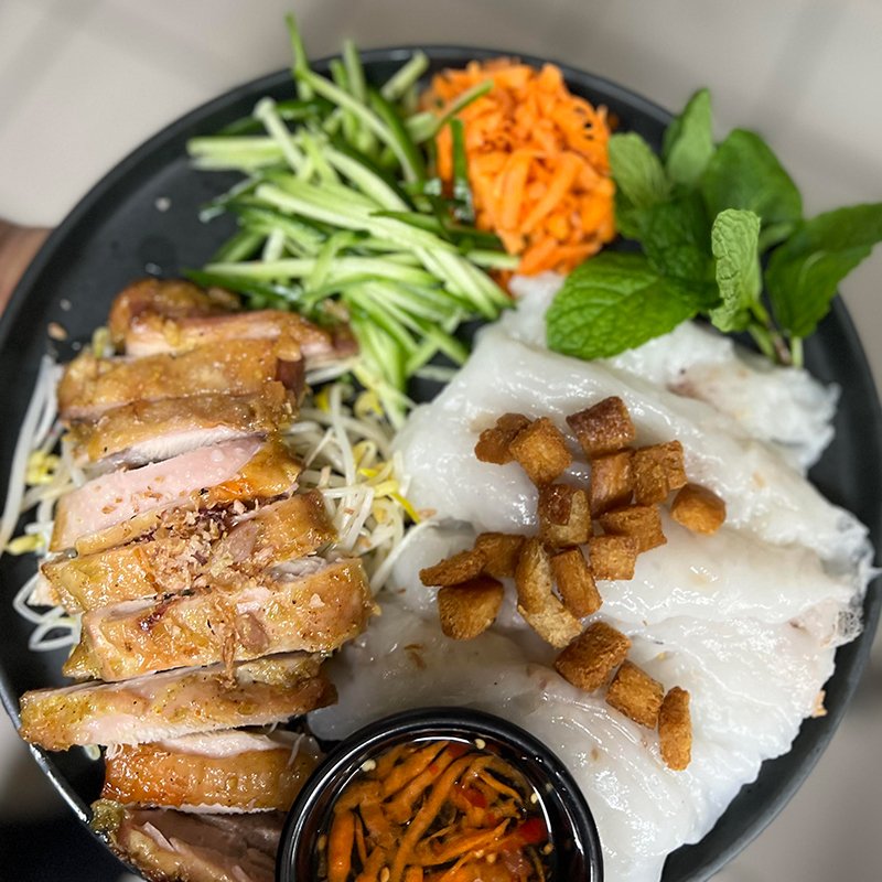 Vietnamese Steam Rice Paper, grilled chicken, pickle carrots, shredded cucumbers, cooked beansprouts, mix salad, Vietnamese herbs, topped with fried shallots and crunchy breadcrumbs.