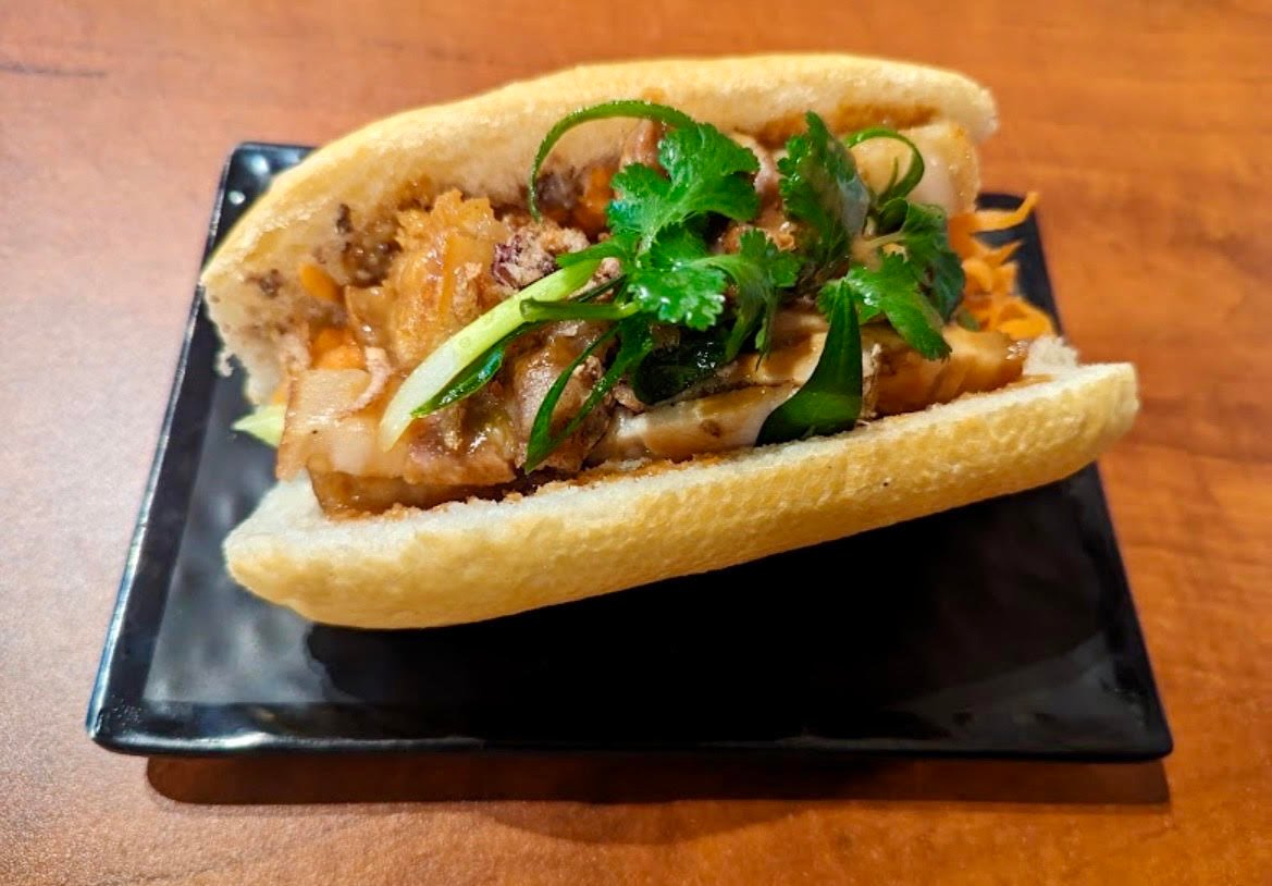Vietnamese bread roll (Banh Mi), crispy pork, mayonnaise, homemade pate, pickle carrot, fresh cucumbers, coriander, onions, fried shallots, herbs, topped with homemade hoisin sauce.