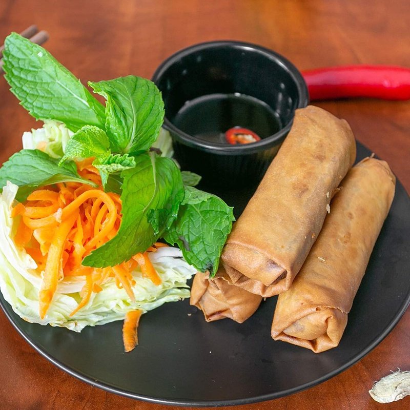 Fresh Vietnamese vegetables wrapped in a dedicate pastry, cooked until golden and crispy, fresh lettuces, mints, pickle carrots and served with Vietnamese homemade dressing sauce.